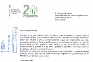 En la carta que ha remitido a Iglesias, Santiago ha propuesto que, más allá de las cuestiones derivadas por la crisis de la COVID-19, se trate la modificación del decreto que marca como se tiene que hacer la valoración de discapacidad para unificar criterios con la de dependencia.