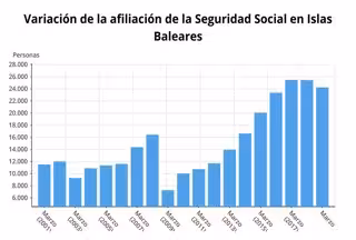 Respecto al mes anterior, la Seguridad Social ha ganado 24.243 afiliados en Baleares, lo que se traduce en un 5,59 por ciento más.
