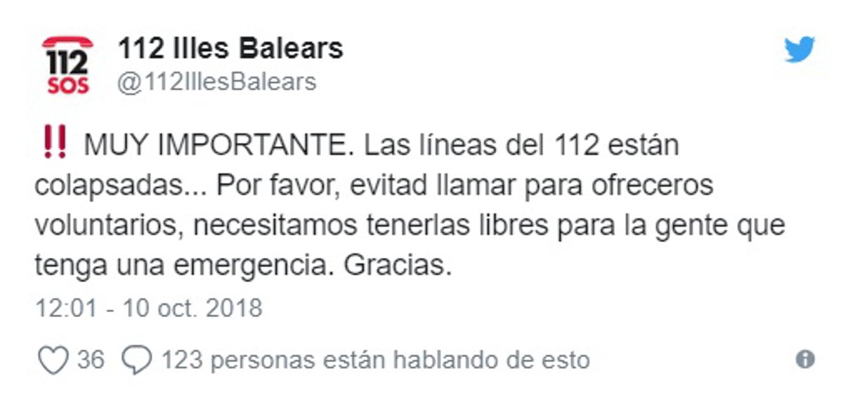 El Servicio de Emergencias de Baleares (SEIB 112) ha informado de que tiene las líneas colapsadas y ha pedido que se evite llamar para ofrecer voluntarios ya que las necesitan para la gente con emergencias.