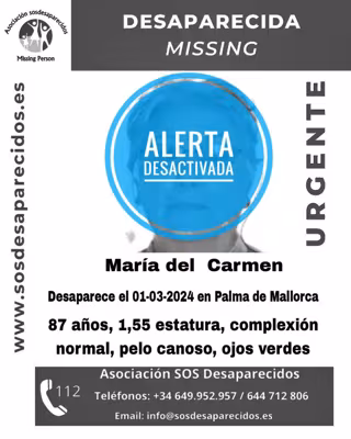 La Asociación SOS Desaparecidos ha desactivado la alerta de búsqueda de una mujer de 87 años, que estaba en paradero desconocido desde el pasado mes de marzo en Palma.