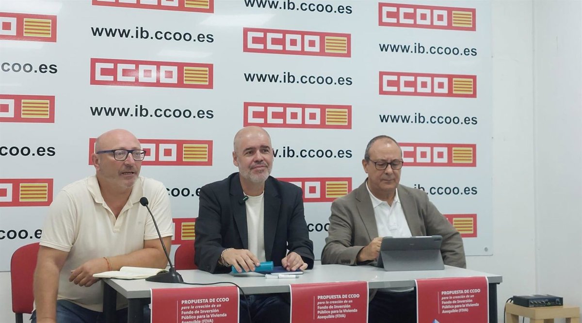 De izquierda a derecha, el secretario general de CCOO Baleares, José Luis García, el secretario general de CCOO, Unai Sordo, y el secretario de Políticas Públicas y Protección Social de CCOO, Carlos Bravo. - EUROPA PRESS