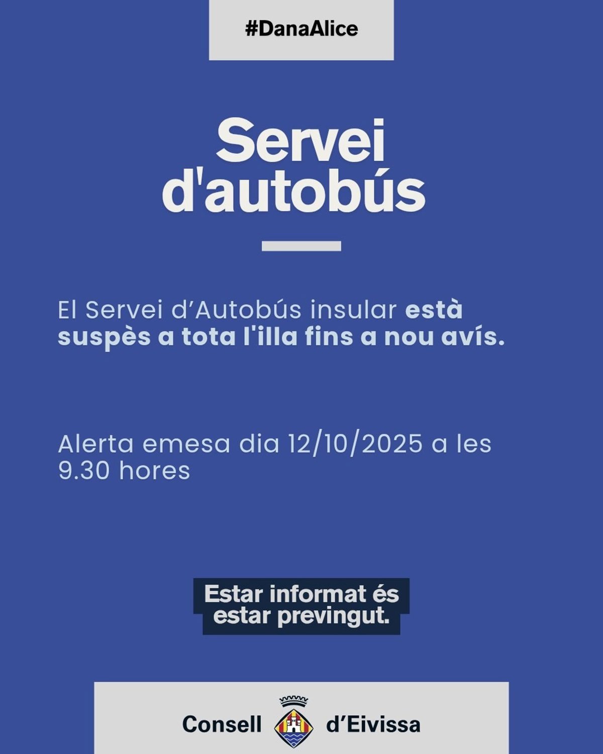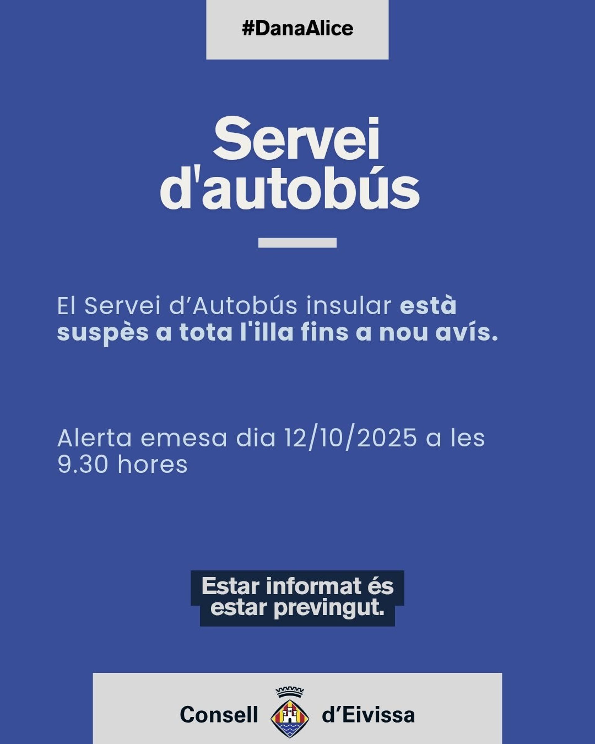 El Consell de Ibiza ha informado que las condiciones actuales, debido a las lluvias y tormentas provocadas por la dana Alice, obligan a suspender el servicio de autobús insular hasta nuevo aviso.