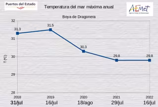 En un mensaje de Twitter recogido por Europa Press, la Aemet ha señalado además que en la boya de Dragonera se alcanzaron los 29,8 grados el pasado sábado.