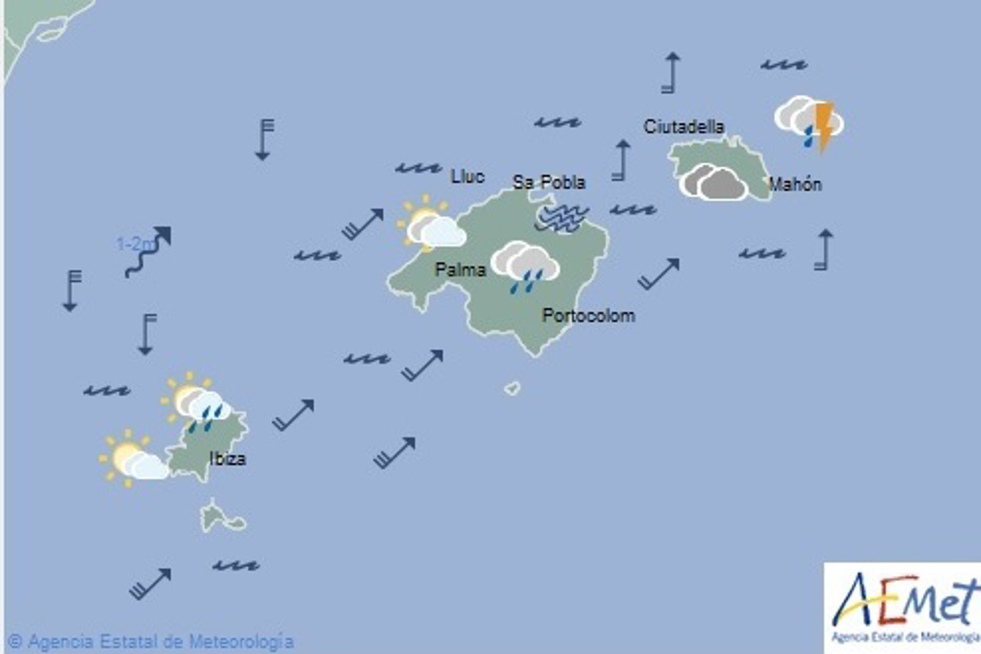 La Agencia Estatal de Meteorología (Aemet) pronostica para este martes 10 de septiembre en Baleares: nuboso a cubierto con chubascos y tormentas fuertes, ocasionalmente muy fuertes, persistentes y con granizo. Temperaturas de madrugada en ascenso y diurnas en descenso, alcanzándose las temperaturas mínimas al final del día. Vientos del sur con intervalos de fuerte, girando a norte en el oeste de Mallorca, rachas que pueden superar los 80 km/h.