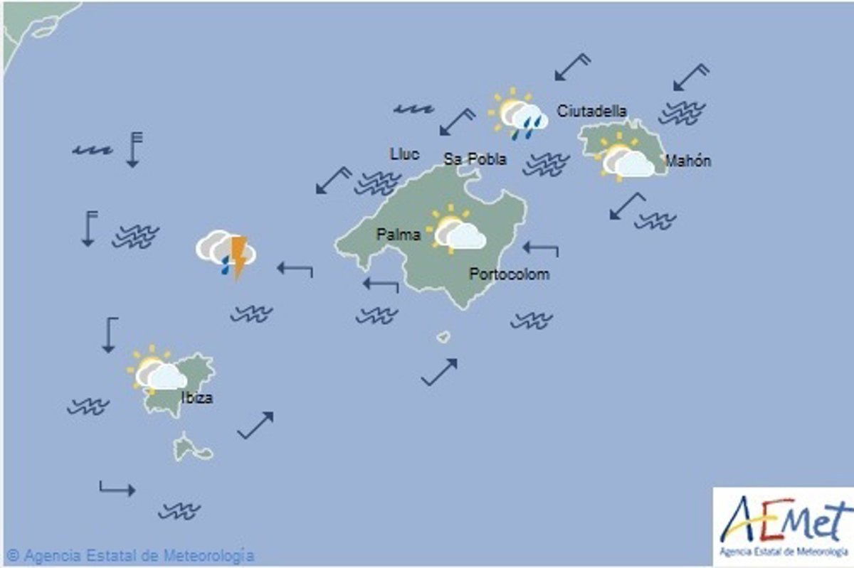 La Agencia Estatal de Meteorología (Aemet) pronostica para este lunes 12 de agosto, en Baleares: cielo nuboso con probabilidad de alguna precipitación con barro, ocasionalmente acompañada de tormenta, tendiendo al final de la tarde a predominar el cielo poco nuboso. Temperaturas nocturnas con pocos cambios y diurnas en descenso, localmente notable. Viento flojo variable aumentando por la mañana a norte y nordeste con algún intervalo de fuerte en la sierra de Tramuntana y nordeste de la isla.