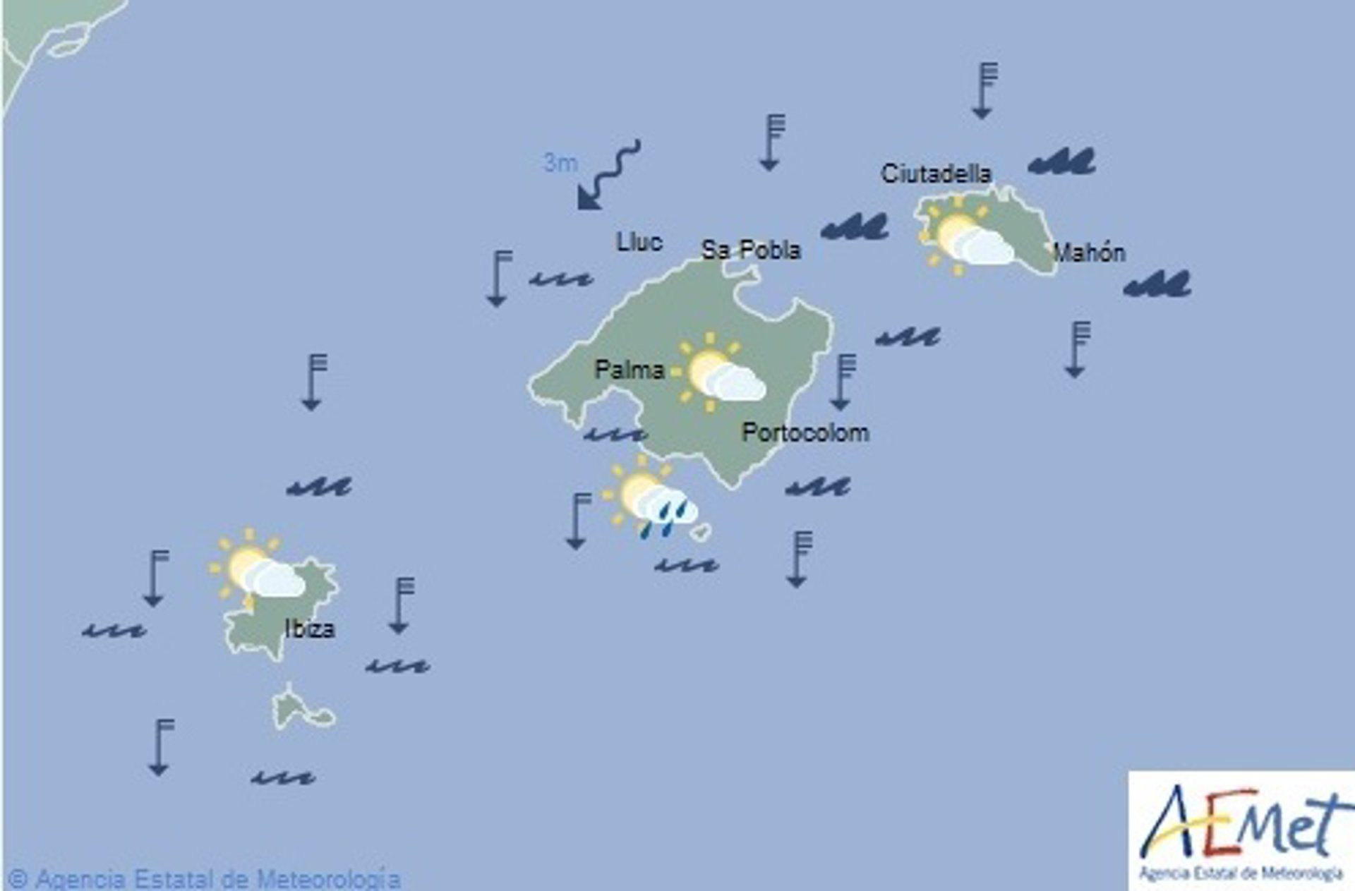 La Agencia Estatal de Meteorología (Aemet) pronostica para este martes 12 de noviembre en Baleares: intervalos nubosos con probabilidad de algún chubasco ocasional. Temperaturas nocturnas en ligero descenso y diurnas en ligero ascenso. En Menorca y nordeste de Mallorca, viento del norte fuerte, con rachas que pueden superar los 90 km/h, disminuyendo por la tarde; en el resto, viento del noroeste con intervalos de fuerte.
