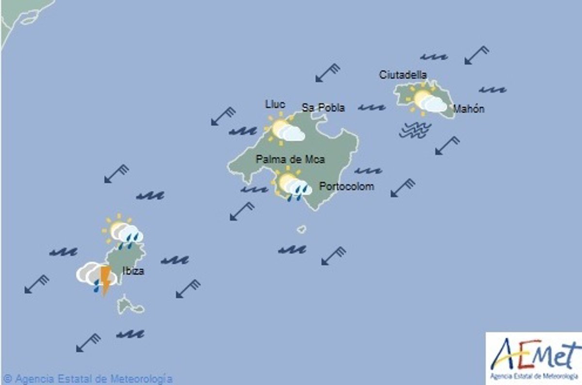 La Agencia Estatal de Meteorología (Aemet) pronostica para este jueves 12 de septiembre en Baleares: Nuboso con precipitaciones hasta el mediodía, tendiendo por la tarde a poco nuboso. Temperaturas en ascenso, especialmente las nocturnas. Vientos del nordeste con algún intervalo de fuerte, y rachas de 60 a 70 km/h.