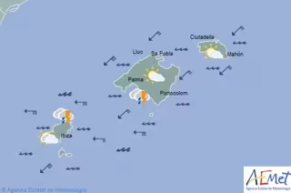 La Agencia Estatal de Meteorología (Aemet) pronostica para este viernes 13 de septiembre en Baleares: cielo nuboso con chubascos localmente fuertes o muy fuertes acompañados de tormenta y granizo, más probables en el sur y oeste de Mallorca. Temperaturas con pocos cambios. Vientos del este con intervalos de fuerte y rachas que pueden alcanzar los 70 km/h.