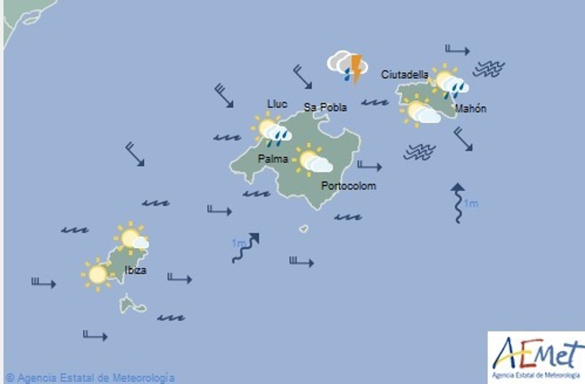 La Agencia Estatal de Meteorología (Aemet) pronostica para este martes 15 de octubre en Baleares: intervalos nubosos con chubascos y tormentas, que podrían ser localmente fuertes en el norte de la isla, tendiendo por la mañana a cielo poco nuboso. Temperaturas nocturnas en ligero descenso y diurnas en notable descenso. Vientos de componente oeste con intervalos de fuerte hasta la mañana. Rachas que pueden superar los 70 km/h en cumbres y cabos.