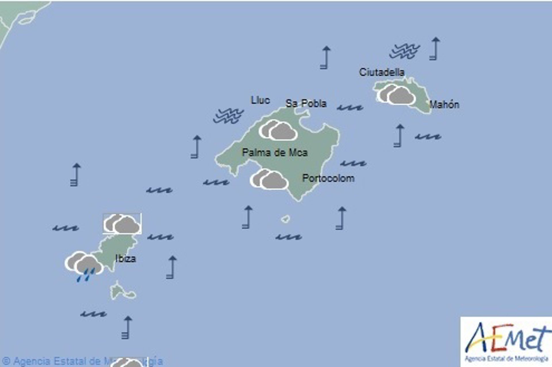 La Agencia Estatal de Meteorología (Aemet) pronostica para este martes 17 de diciembre en Baleares: cielo cubierto con precipitaciones, a partir de la mañana, que podrían ir acompañadas de tormenta y barro. Temperaturas nocturnas en ascenso respecto a la madrugada anterior, y diurnas en ligero descenso, alcanzándose las mínimas al final. Vientos del sur y suroeste, con algún intervalo fuerte, disminuyendo por la noche a flojos variables.