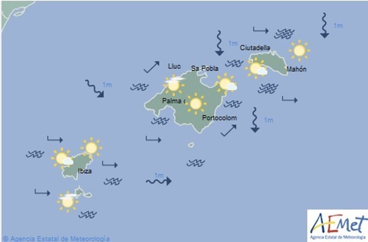 La Agencia Estatal de Meteorología (Aemet) pronostica para este martes 24 de diciembre en Baleares: cielo poco nuboso o despejado con intervalos de nubes altas. Temperaturas nocturnas en descenso localmente notable, y diurnas en ascenso. Vientos del oeste y suroeste en general flojos.