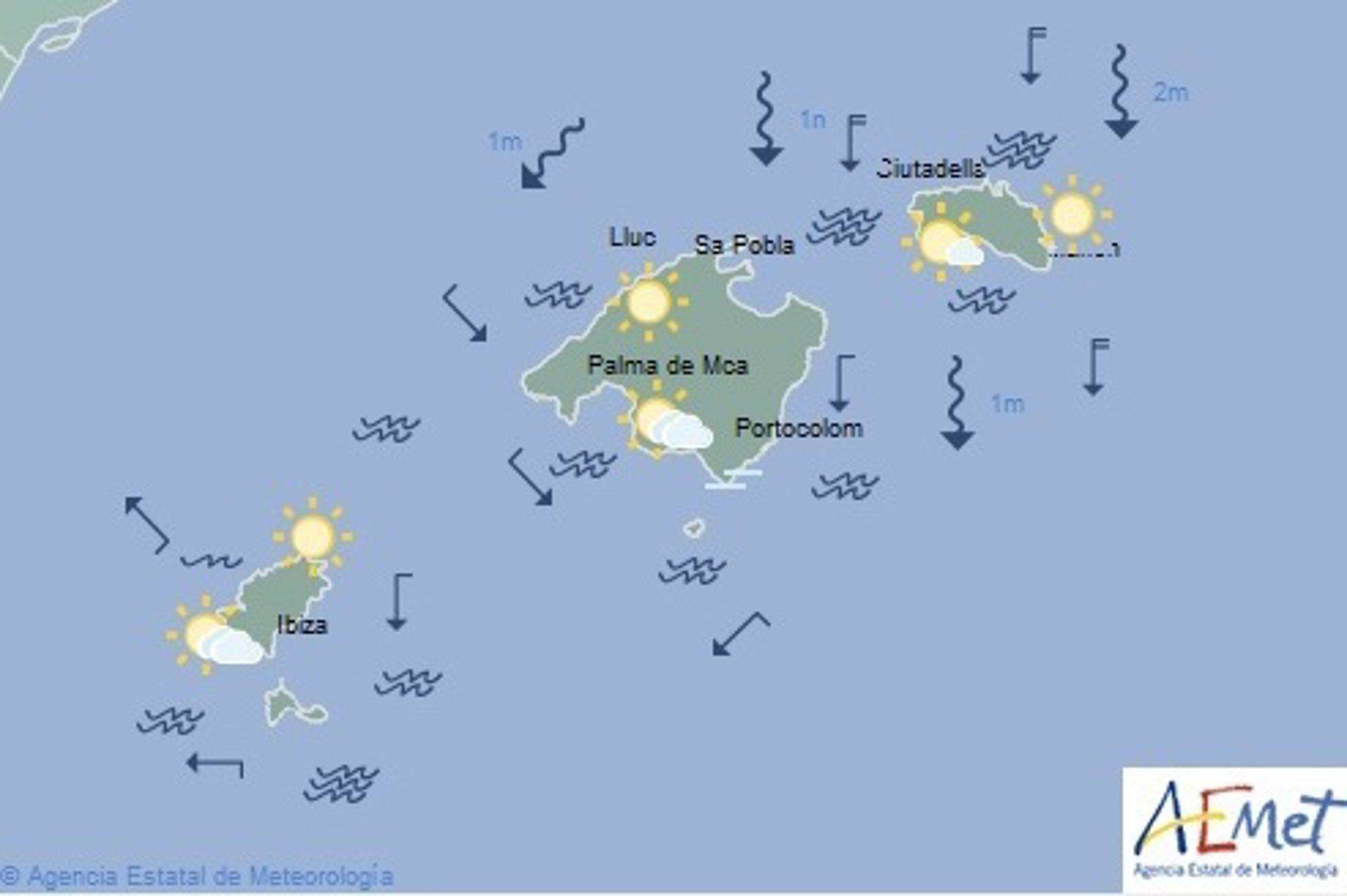 La Agencia Estatal de Meteorología (Aemet) pronostica para este viernes 27 de diciembre en Baleares: cielo poco nuboso o despejado con intervalos de nubes bajas. Brumas sin descartar algún banco de niebla matinal en Mallorca. Temperaturas nocturnas con pocos cambios, en ascenso en Menorca, y diurnas en descenso. En Menorca y nordeste de Mallorca, vientos de componente norte; en el resto, vientos flojos.