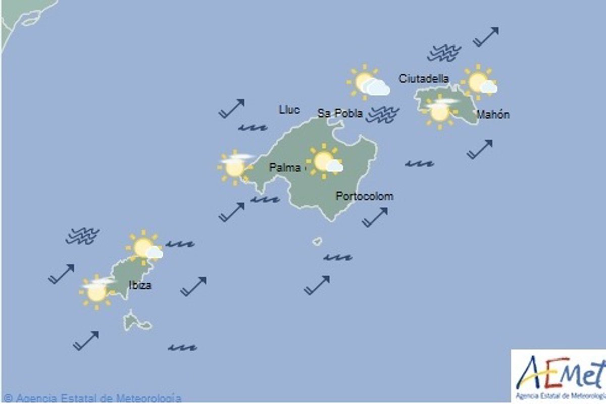 La Agencia Estatal de Meteorología (Aemet) pronostica para este miércoles 27 de noviembre en Baleares: intervalos nubosos tendiendo por la mañana a poco nuboso con intervalos de nubes altas. Baja probabilidad de alguna precipitación débil ocasional de madrugada al norte del archipiélago. Temperaturas nocturnas en ascenso y diurnas con pocos cambios. Vientos del oeste y suroeste.