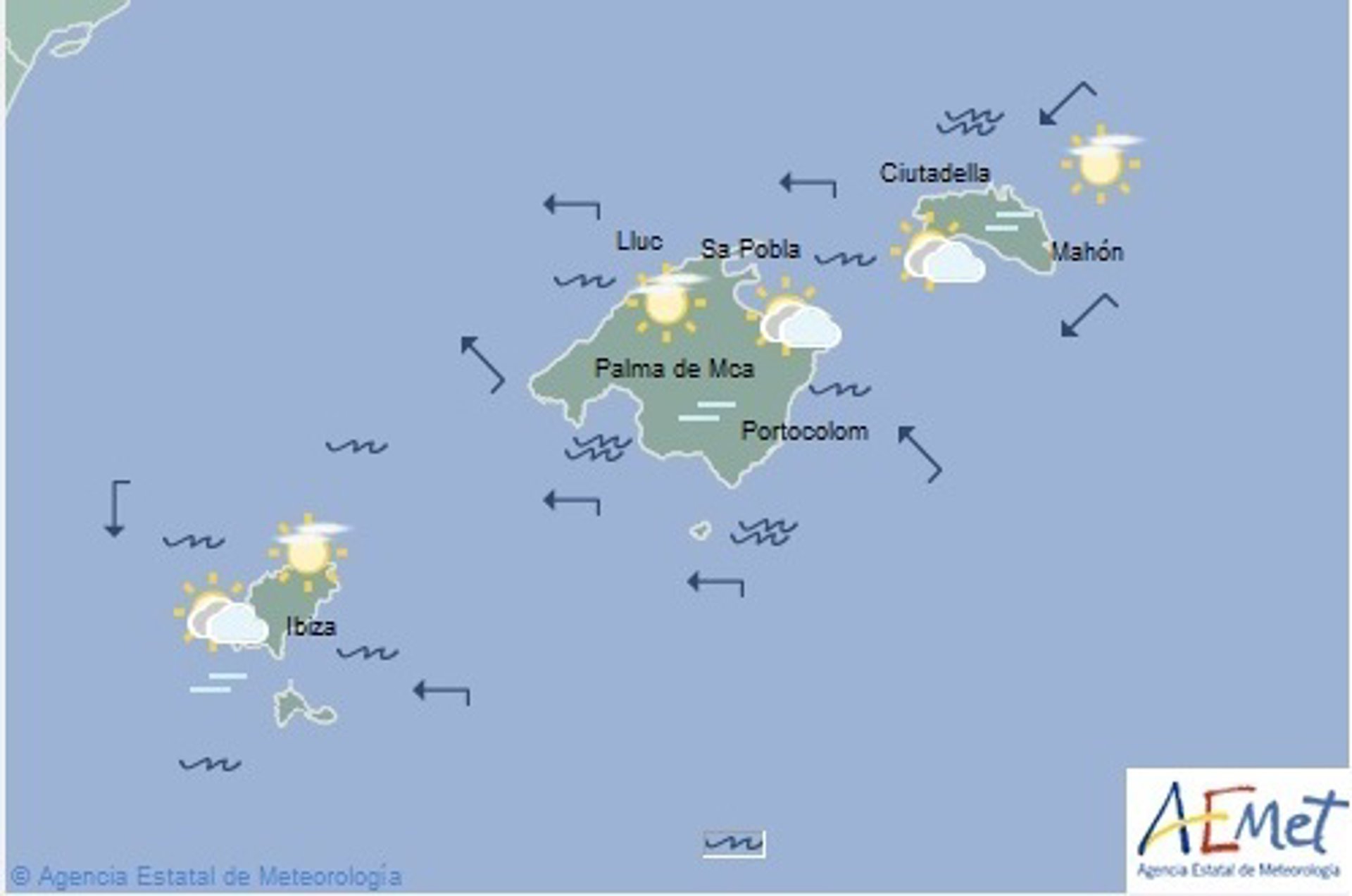 La Agencia Estatal de Meteorología (Aemet) pronostica para este jueves 8 de agosto, en Baleares: cielo nuboso con predominio de nubes medias y altas, tendiendo a partir de la mañana a poco nuboso. Brumas matinales. Temperaturas sin cambios o en ligero descenso. Vientos flojos con brisas costeras.
