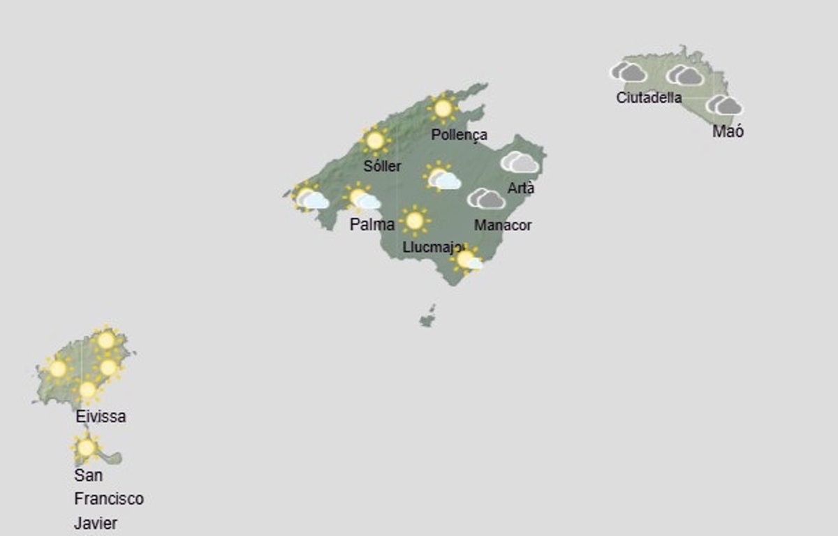 La Agencia Estatal de Meteorología (Aemet) pronostica para hoy domingo, 11 de enero, en Baleares: intervalos nubosos con alguna precipitación débil y ocasional en Menorca y norte de Mallorca hasta la mañana, tendiendo durante la tarde a cielo poco nuboso. Temperaturas nocturnas con pocos cambios o en descenso, localmente notable en Mallorca, y diurnas sin cambios o en ligero ascenso. Viento entre flojo y moderado del norte y noroeste, con intervalos de fuerte de madrugada, disminuyendo por la tarde a flojo del oeste y suroeste.