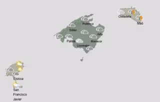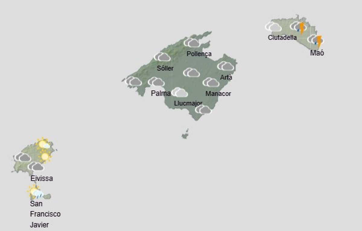 La Agencia Estatal de Meteorología (Aemet) pronostica para hoy domingo, 18 de enero, en Baleares: cielo cubierto tendiendo a intervalos nubosos desde las Pitiusas. Lluvias y chubascos que podrían ser localmente fuertes e ir acompañados de tormenta y granizo pequeño, principalmente en Menorca hasta la mañana. Temperaturas con pocos cambios o en descenso, alcanzándose las mínimas al final del día. Viento en general flojo del sur y suroeste tendiendo a variable.