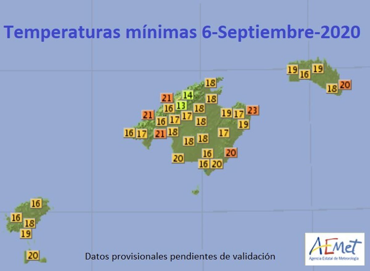 Termperaturas mínimas en Baleares para este 6 de septiembre. - AEMET