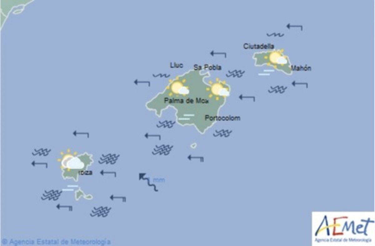 La Agencia Estatal de Meteorología (Aemet) pronostica para este jueves 14 de febrero, en Baleares: predominio de poco nuboso. Brumas matinales, sin descartar algún banco de niebla. Temperaturas nocturnas sin cambios o en ascenso, con heladas débiles locales, y diurnas con pocos cambios. Vientos del este, en general flojos.