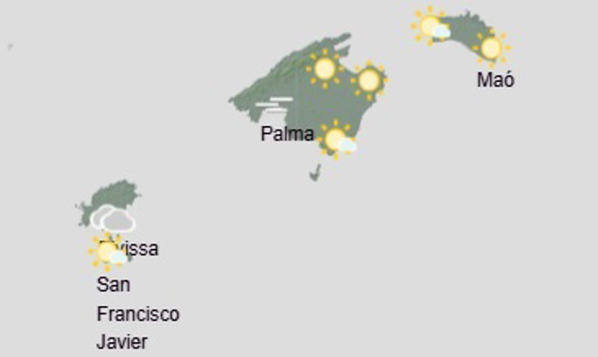 Bancos de niebla hasta primeras horas de la mañana. Temperaturas con pocos cambios o en ligero ascenso. Viento en calma o flojo variable predominando el oeste en Menorca y la componente sur en el resto.