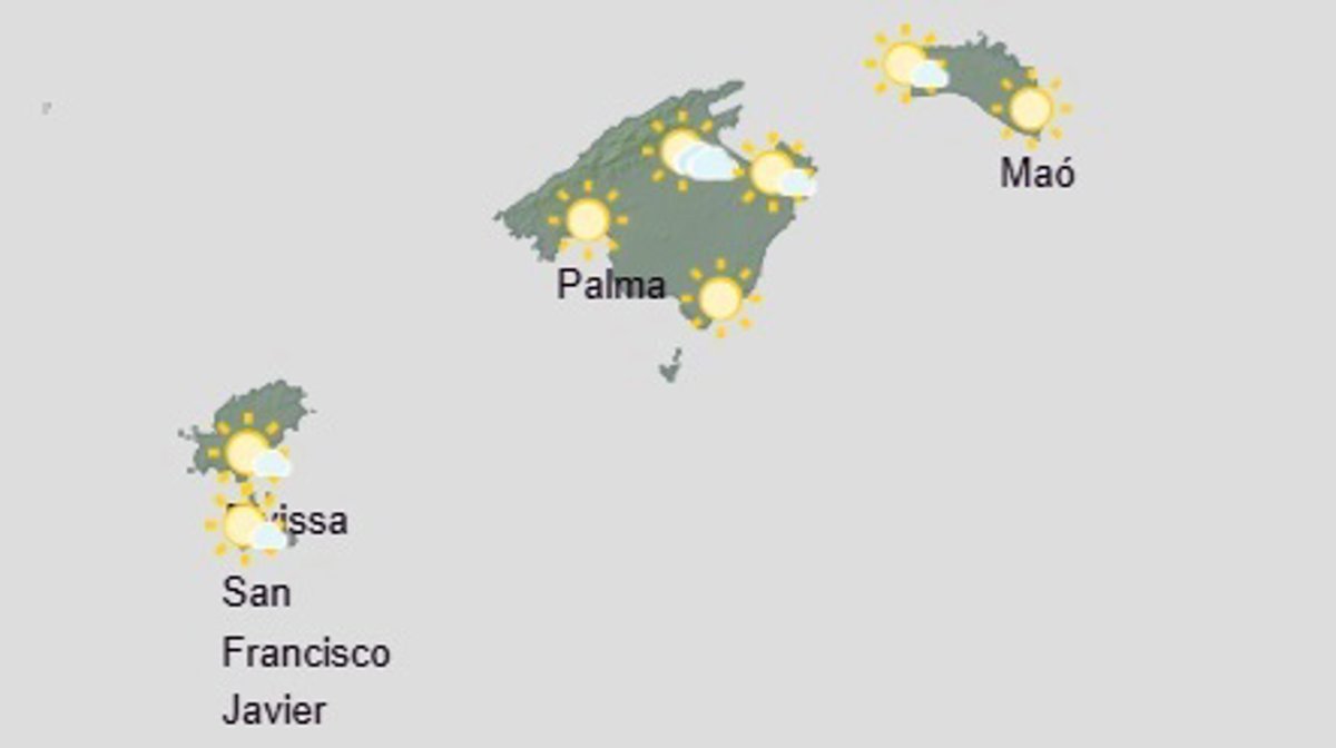 La Agencia Estatal de Meteorología (Aemet) prevé para este lunes cielo poco nuboso con nubes de evolución diurna aumentando por la noche a nuboso, con probabilidad de algún chubasco ocasional por la tarde en el este y nordeste de Mallorca y de Menorca.
