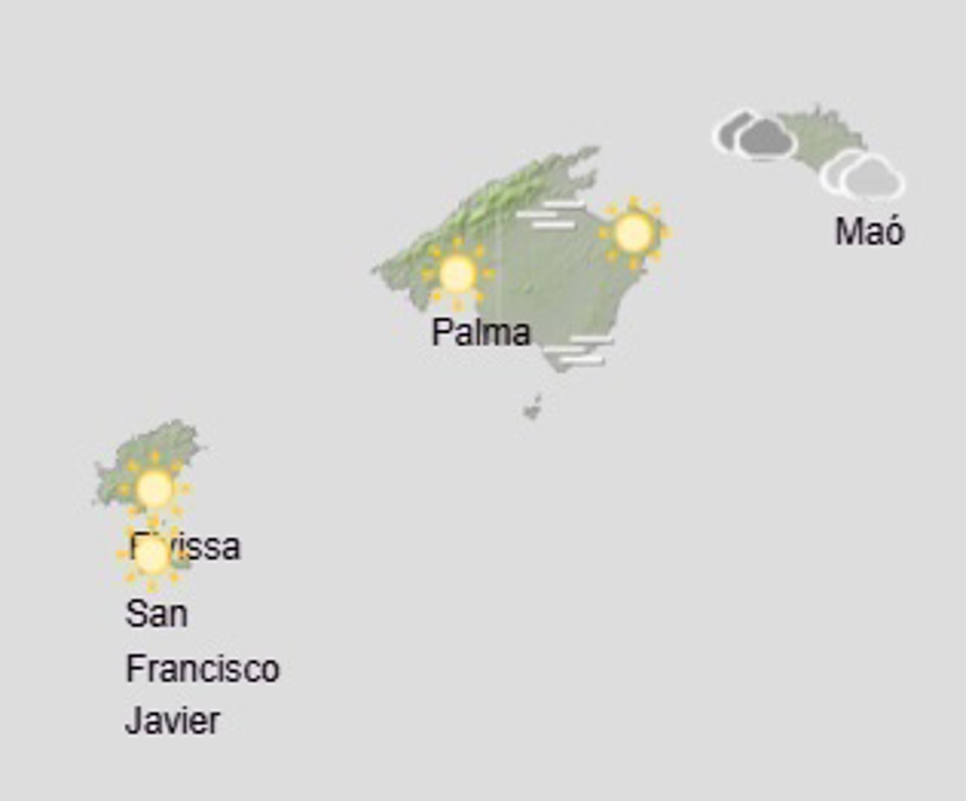 La Agencia Estatal de Meteorología (Aemet) prevé para este martes en Menorca y Mallorca, intervalos nubosos con baja probabilidad de alguna precipitación débil y ocasional; en Ibiza y Formentera, cielo poco nuboso con algún intervalo de nubes altas.