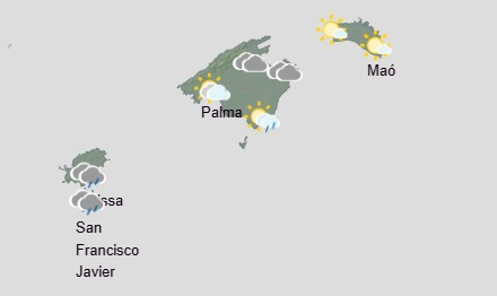 Precipitaciones ocasionales, más probables en Mallorca y en las Pitiusas donde pueden ser localmente fuertes y con tormenta. Temperaturas con pocos cambios. Viento flojo a moderado del nordeste.