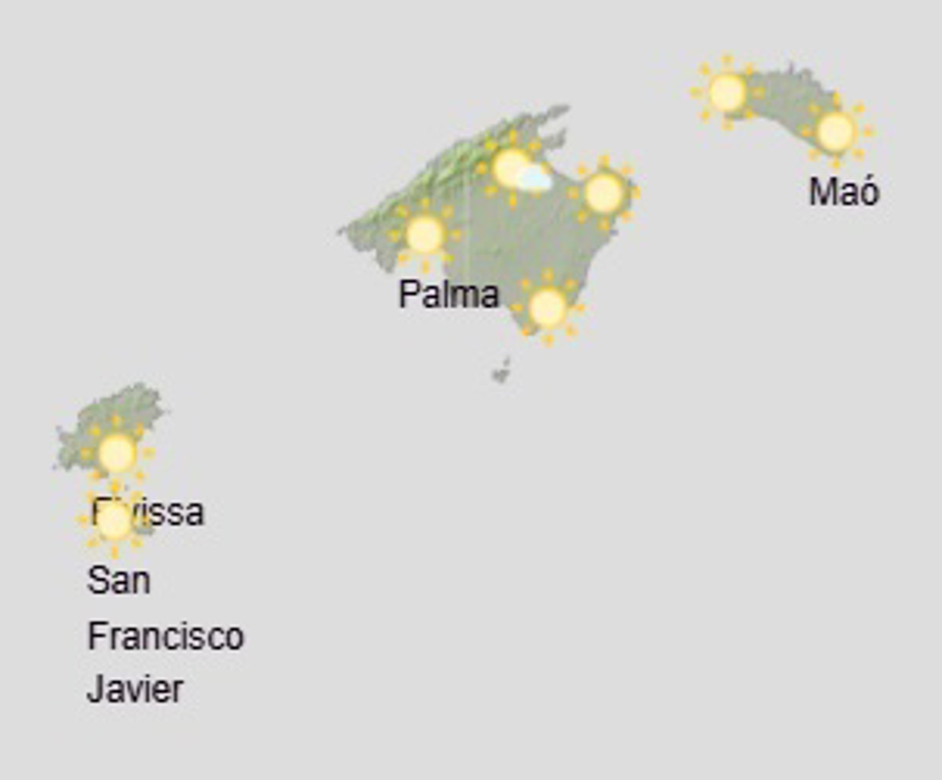 Temperaturas nocturnas en ascenso y diurnas con pocos cambios. Viento moderado del oeste con intervalos de fuerte y rachas que pueden superar los 70 km/h en Menorca y Mallorca, y los 90 km/h en cumbres y cabos de dichas islas.