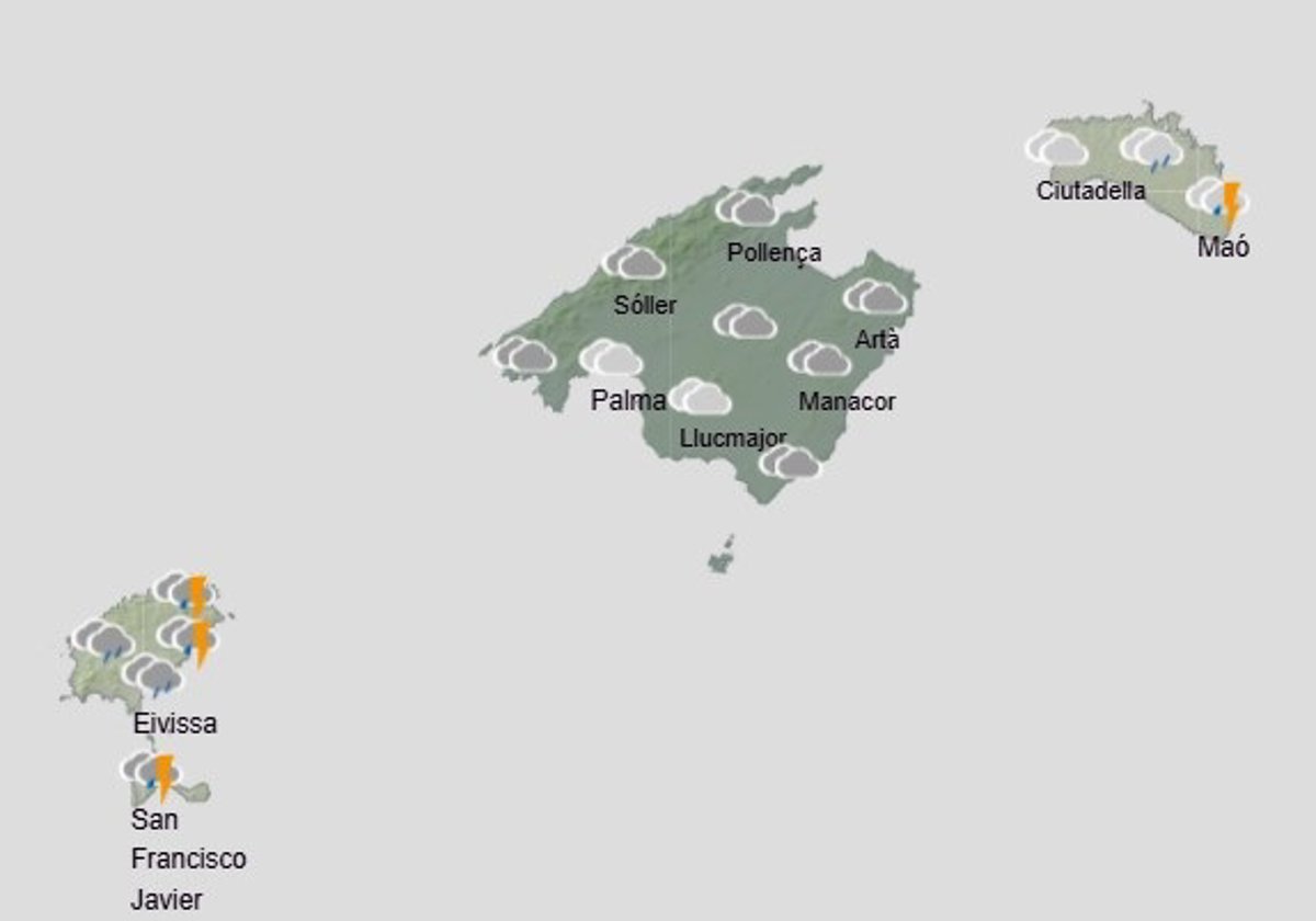 La Agencia Estatal de Meteorología (Aemet) pronostica para hoy sábado, 20 de diciembre, en Baleares: cielo cubierto con lluvias y chubascos que pueden ser localmente fuertes e ir acompañados de tormenta. Temperaturas con pocos cambios o en descenso. Viento en general flojo de dirección variable tendiendo a componente oeste.