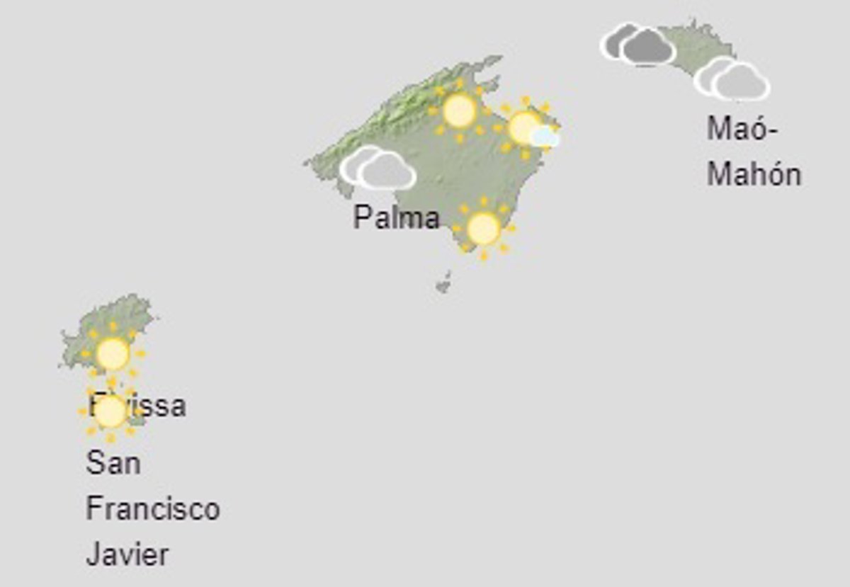 La Agencia Estatal de Meteorología (Aemet) pronostica para hoy sábado, 26 de diciembre, en Baleares: en Menorca y Mallorca, intervalos nubosos con precipitaciones débiles ocasionales hasta la tarde; en Ibiza y Formentera, cielo poco nuboso o despejado. Cota de nieve a 400 metros. Temperaturas en descenso, con heladas débiles locales en Mallorca, las mínimas se producirán al final del día. En Menorca y nordeste de Mallorca, viento del norte fuerte con rachas de 70 a 80 km/h hasta la tarde; en el resto, viento del norte con intervalos de fuerte disminuyendo por la tarde a flojo.