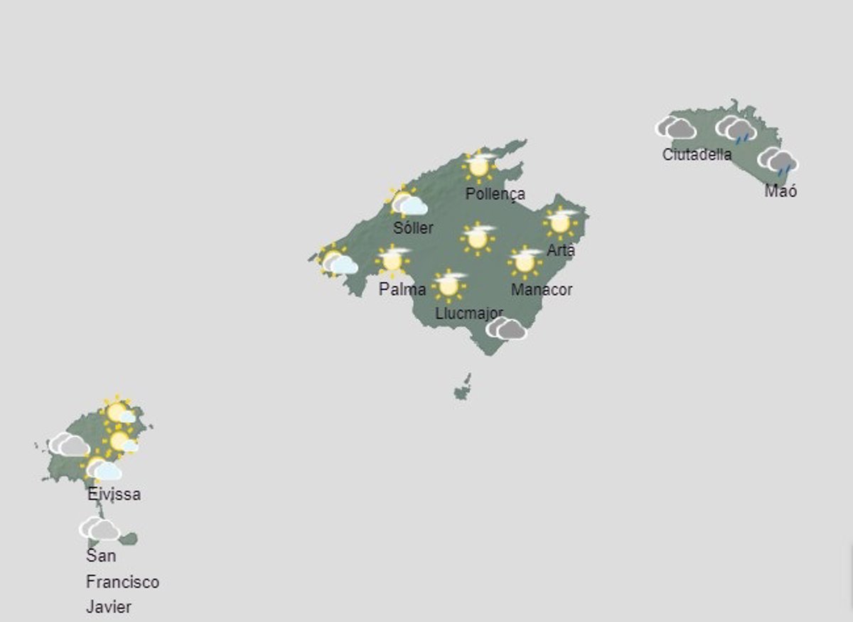 Además, se esperan temperaturas nocturnas en notable ascenso y diurnas en ligero descenso, alcanzándose las mínimas al final del día. El viento será moderado con intervalos fuertes, del suroeste girando hacia el mediodía a norte y noroeste con rachas que en Menorca por la noche podrían alcanzar los 70 kilómetros por hora (km/h), y en cabos y cumbres los 90 km/h.