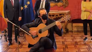 El guitarrista Gaspar Muller, ganador del concurso musical del Día de Europa 2020, interpreta el 'Himno de la Alegría' en el Parlament con motivo del acto institucional por el Día de Europa. - PARLAMENT IB
