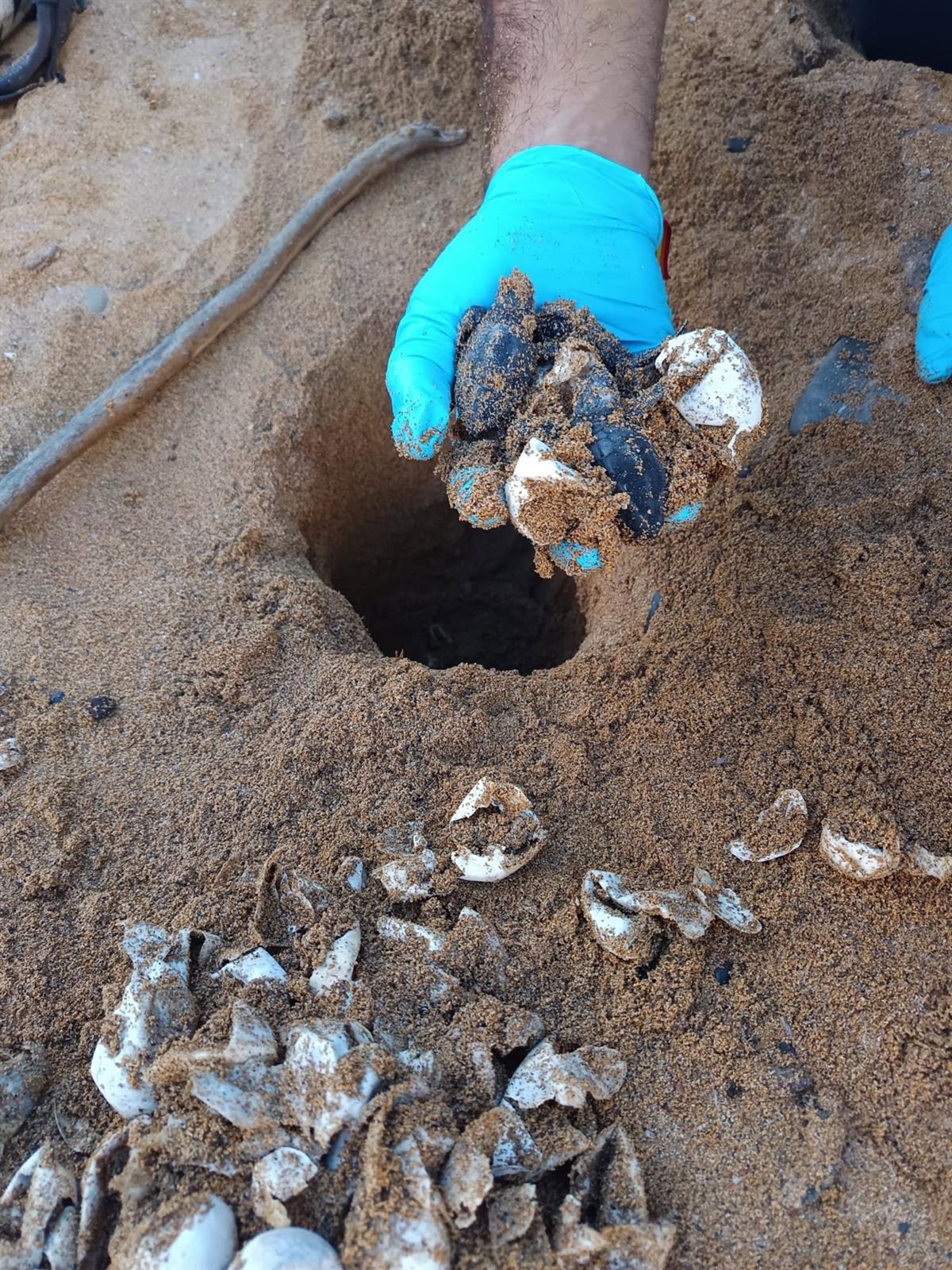 Finalmente, se pudo localizar el nido y el resultado ha sido el hallazgo de 25 crías de tortuga marina vivas, cuatro huevos aún por eclosionar y 66 huevos ya eclosionados, de los que habrían salido las tortugas nacidas previamente.