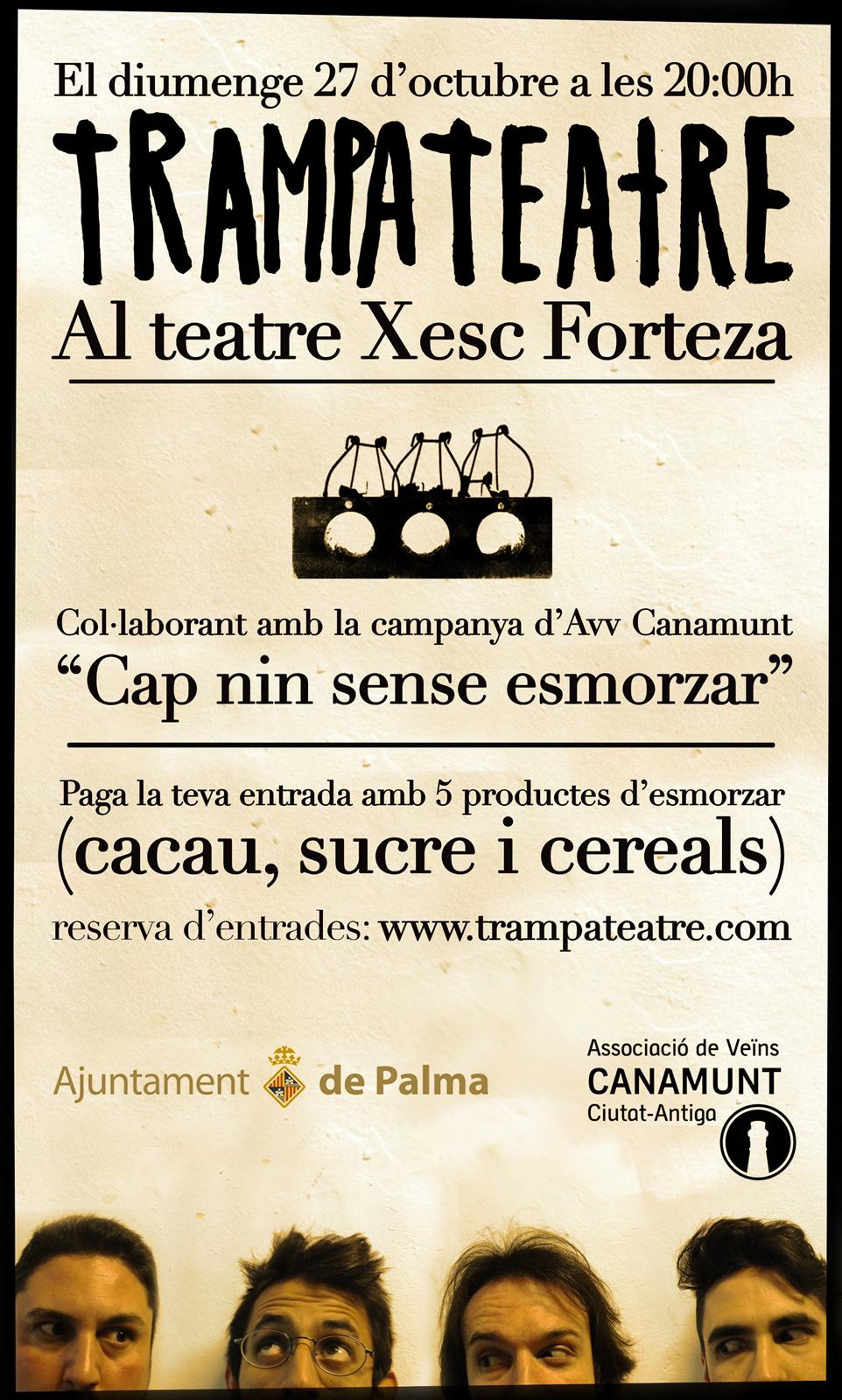 Para ello, TrampaTeatre se suma a la campaña ya iniciada por la asociación Canamunt 'Cap nin sense esmorzar' y lo hace con una actuación especial en el Xesc Forteza en la que la entrada se pagará en forma de cinco alimentos básicos de desayuno, como cereales, azúcar y cacao.