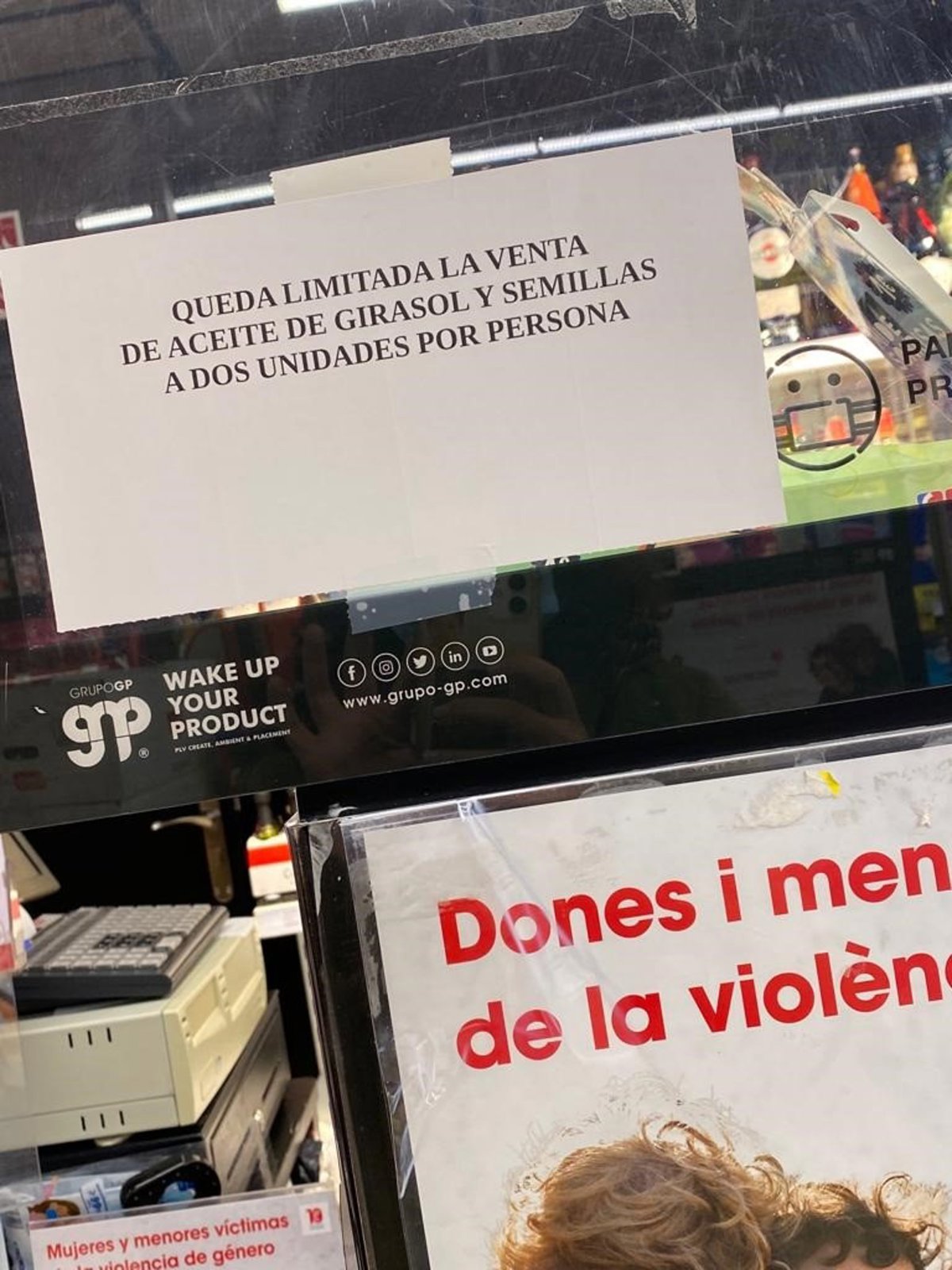 Mensaje en un supermercado advirtiendo de la limitación por persona del aceite de girasol. - EUROPA PRESS