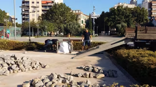 El Ayuntamiento de Palma ha trasladado esta mañana a Es Baluard la escultura 'Cinc camins' del artista Richard Long, que se encontraba ubicada en el Parque de las Estaciones.