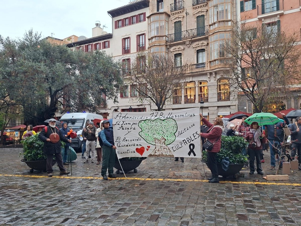 Un grupo de vecinos y miembros de entidades se ha congregado este lunes, en la plaza de Cort, para pedir al Ayuntamiento de Palma "asumir responsabilidades políticas y técnicas" por la tala, el pasado jueves, de los bellasombras del barrio de la Calatrava.