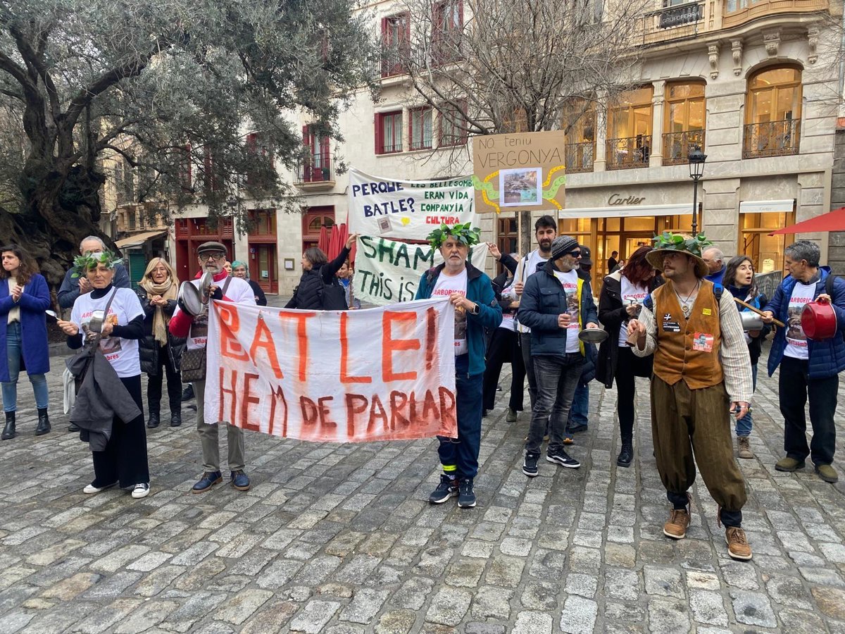 Varios integrantes de la Plataforma por la Defensa de los Bellasombra, han protestado frente al Ayuntamiento de Palma para exigir la paralización de las tareas de replantación de los 17 bellasombra de la plaza Llorenç Villalonga que fueron talados el pasado diciembre.