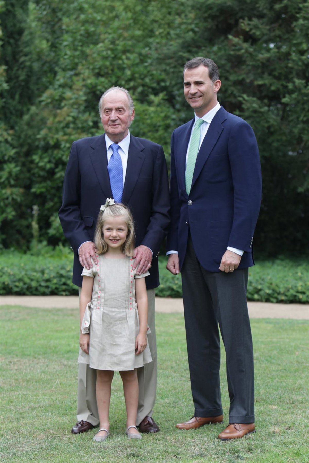 En las imágenes, los protagonistas aparecen con gesto relajado y sonriente. En una de ellas, sentados, la Infanta Leonor descansa apoyada en las piernas de su padre, que mira al frente mientras es observado directamente por el Rey. En otra permanecen los tres de pie, mientras Don Juan Carlos sostiene por los hombros a la primogénita del Príncipe Felipe.