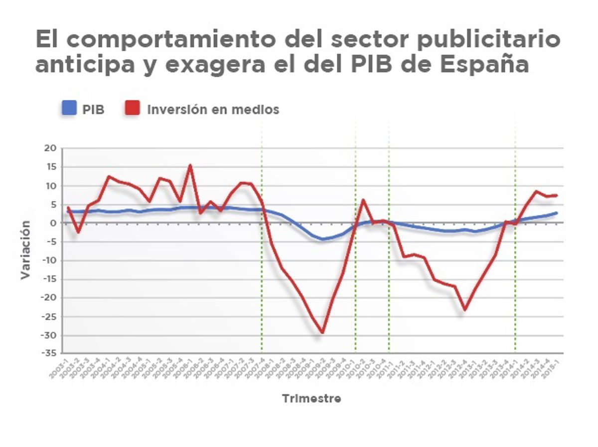 Más allá del propio sector publicitario, este repunte en inversión en medios vaticina un aumento de la actividad económica y del PIB español ya que cíclicamente los repuntes de inversión publicitaria anticipan buenos ciclos económicos, como se refleja en el gráfico adjunto elaborado por el departamento de investigación de Ymedia.