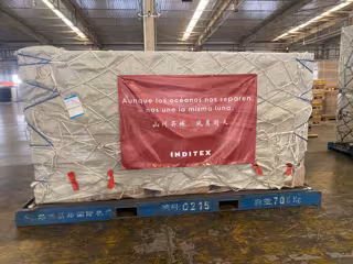 Paquete en un carguero preparado para ser enviado en el que se lee 'Aunque los océanos nos separen, nos une la misma luna'. Este es uno de los paquetes que incluyen algunas de las 300.000 mascarillas donadas por Inditex que llegarán a España desde China - Inditex - Archivo