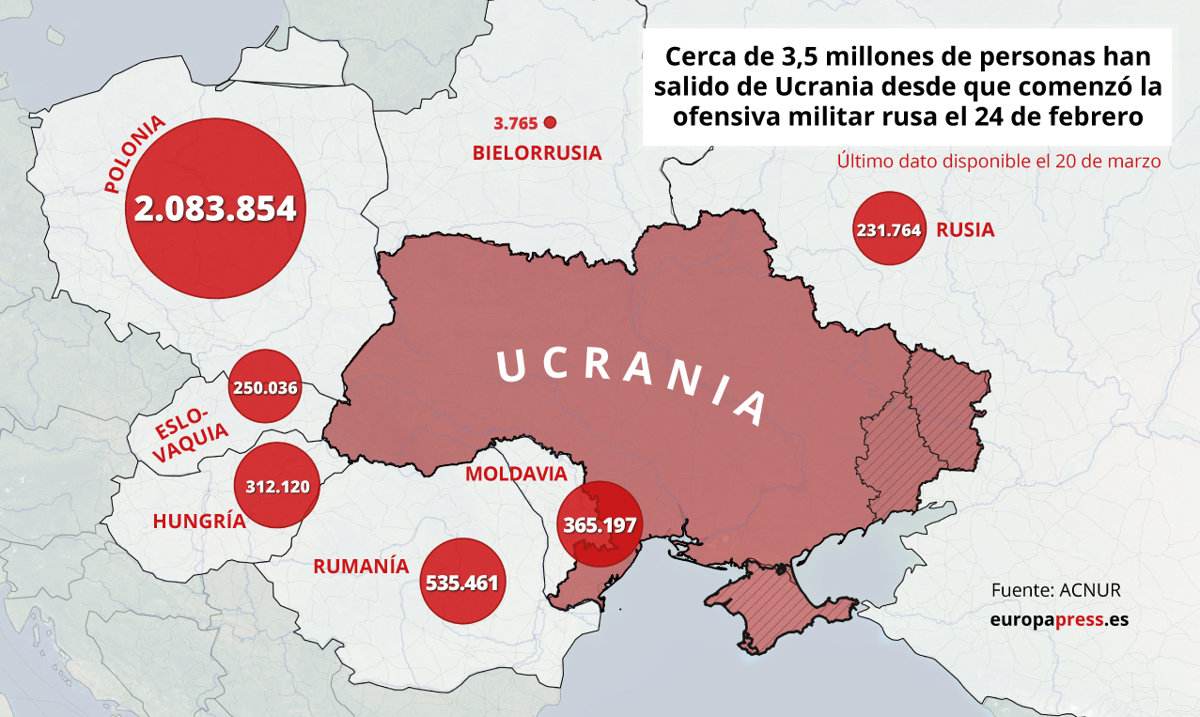 MADRID, 21 Mar. (EUROPA PRESS) - Unos 3,5 millones de personas han salido de Ucrania desde que Rusia lanzó su invasión el 24 de febrero, según datos del Alto Comisionado de la ONU para los Refugiados (ACNUR), que estima que en más de diez millones quienes han tenido que abandonar sus hogares en menos de cuatro semanas. Polonia ha recibido ya a más de dos millones de refugiados, si bien no está claro cuántos se han quedado en territorio polaco. Rumanía acumula más de 535.000 llegadas, frente a las 365.000 de Moldavia, las 312.000 de Hungría y las 250.000 de Eslovaquia. ACNUR también tiene registrados casi 232.000 refugiados en Rusia, destino en gran medida de quienes viven en la zona este de Ucrania, en áreas controladas por los rebeldes separatistas. Además, unas 3.700 personas han cruzado la frontera hacia Bielorrusia, país aliado de Moscú en este conflicto. "Entre las responsabilidades de quienes libran guerras en todo el mundo, está el sufrimiento infligido a los civiles que se ven obligados a huir de sus hogares", lamentó el domingo el jefe de ACNUR, Filippo Grandi, al anunciar que se había superado el umbral de diez millones de refugiados y desplazados internos.