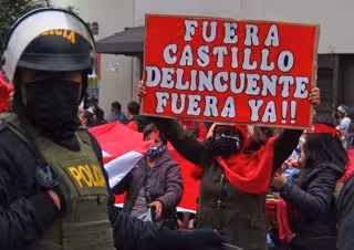 Un manifestante sostiene una pancarta en la que se puede leer "Fuera Castillo, fuera ya" durante una protesta contra el presidente Pedro Castillo con motivo del 201 Día de la Independencia de Perú - Carlos Garcia Granthon/ZUMA Pres / DPA
