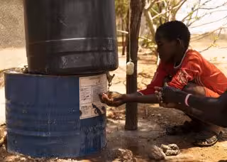 Un niño refugiado somalí se lava las manos antes de ingresar al centro de salud en el campamento de Buramino, Etiopía - GIULIA NABONI / ACNUR / FUNDACIÓN LA CAIXA