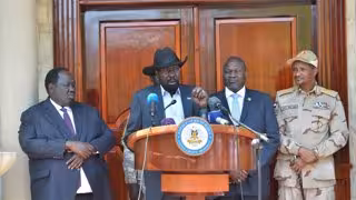 Salva Kiir, presidente de Sudán del Sur, anuncia el acuerdo para la formación del gobierno de unidad junto a Riek Machar y el jefe del Consejo Soberano de Sudán, Mohamed Hamdan Dagao - PRESIDENCIA DE SUDÁN DEL SUR