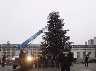 Una portavoz de la Policía berlinesa ha informado de que dos personas subidas a una plataforma elevadora han desplegado una pancarta que rezaba 'esto es solo la punta del árbol de Navidad' en la plaza Pariser del distrito Mitte de Berlín.