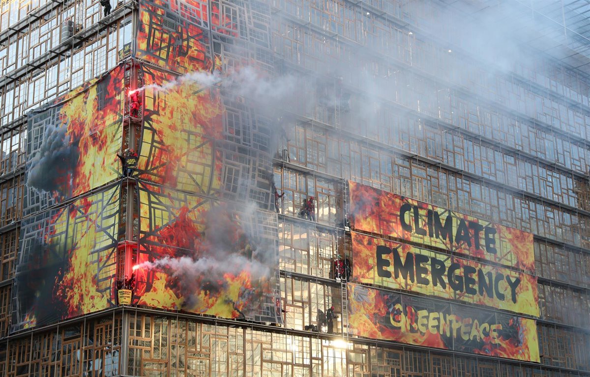 Más de una docena de activistas de Greenpeace han tomado este jueves por la mañana la fachada del edificio de Bruselas que acogerá la cumbre de jefes de Estado y de Gobierno de la Unión Europea para colgar una pancarta en la que alertan sobre la "emergencia climática" que vive el planeta.