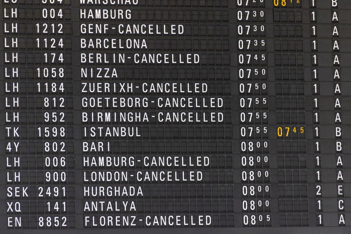 25 July 2024, Hesse, Frankfurt/Main: A display board at Frankfurt Airport shows numerous canceled departures. Air traffic was temporarily suspended after climate activists forced their way onto the airport premises early in the morning and got stuck. Phot - Helmut Fricke/dpa