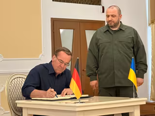 El ministro de Defensa alemán, Boris Pistorius, junto a su par ucraniano, Rustem Umerov, en Odesa, Ucrania - Jörg Blank/dpa