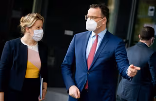 La ministra de Familia alemana, Franziska Giffey, con el ministro de Sanidad, Jens Spahn, saliendo de una comparecencia ante la prensa en Berlín - Kay Nietfeld/dpa-Pool/dpa