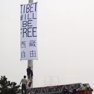 Los manifestantes desplegaron pancartas con inscripciones tales como "Un mundo, un sueño: Libertad para Tíbet" y "Tíbet será libre", señaló en un comunicado enviado por correo electrónico la agrupación Students for a Free Tibet. Uno de los carteles rezaba "Libertad para Tíbet" en chino. Los cuatro arrestados, tres hombres y una mujer, treparon a postes de electricidad para desplegar las pancartas, precisó la agencia estatal china de noticias Xinhua.